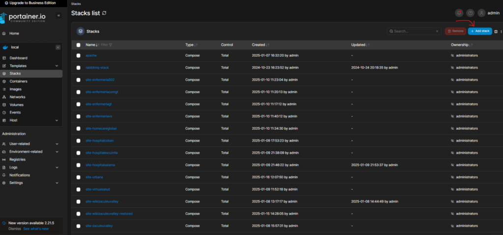2- Seleccionar la opción de STACKS en el menú izquierdo y luego seleccionar ADD STACK