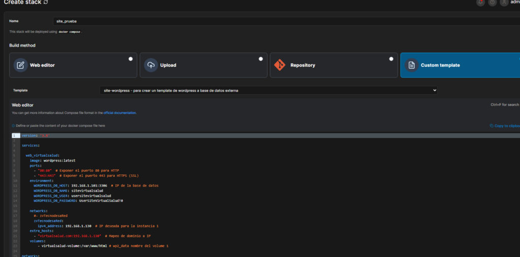- En los templates, seleccionar la opción de site-wordpress – para crear un tamplate de wordpress a base de datos externa