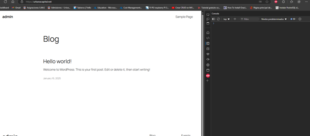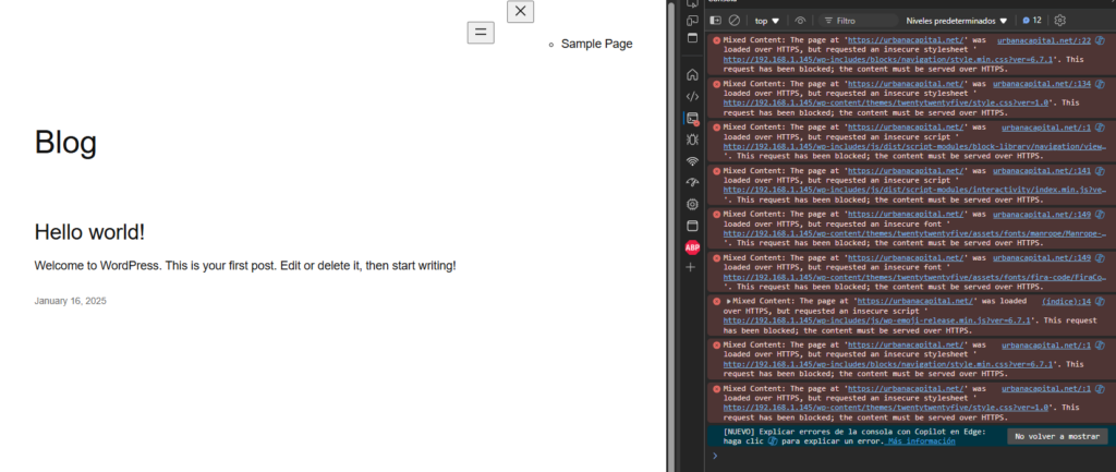 Al instalar un WordPress vacío, si el contenido se mezcla o visualmente no se ve correctamente: que no cargan imágenes, la estructura del sitio web no está bien, es porque hay contenido mixto. En siguiente ejemplo se muestra el MIXED CONTENT porque en una vista de una computadora, depliega el menú para dispositivos móviles.