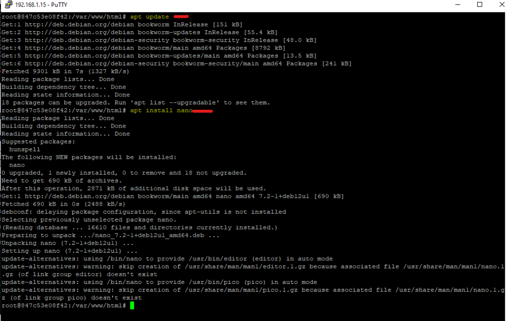 2- Dentro del container, actualizar repositorios, instalar editores de contenido, crear archivos del apache, modificar archivos de configuración del wordpress.