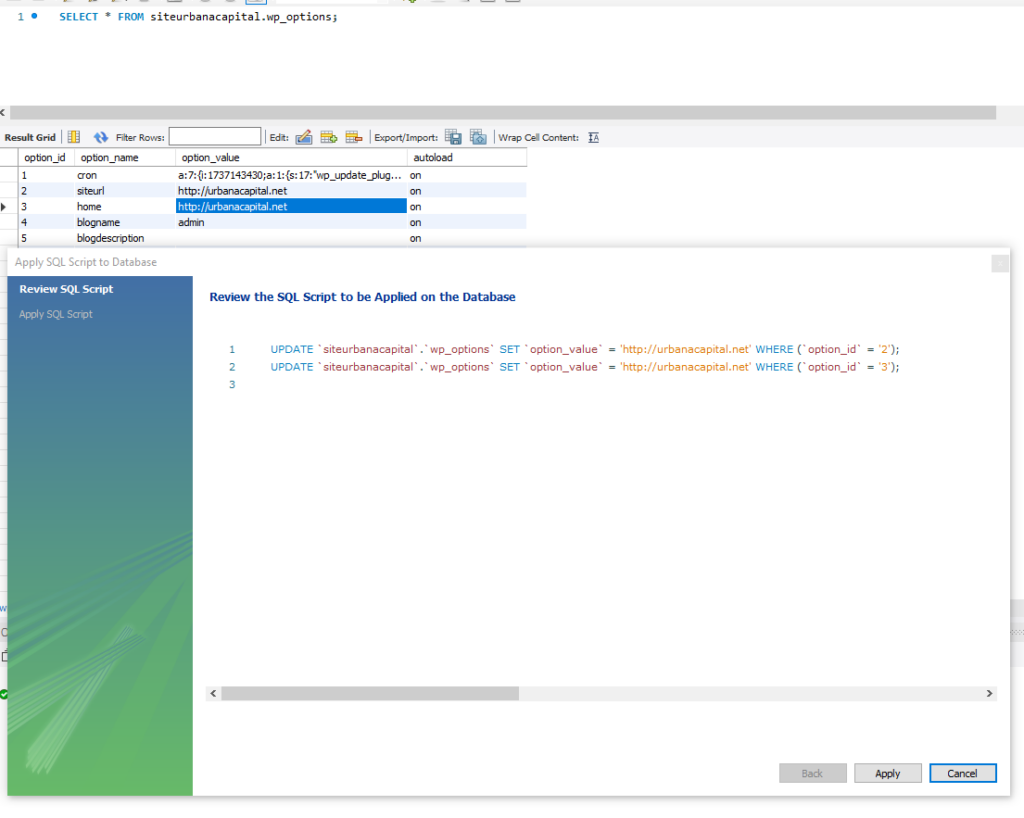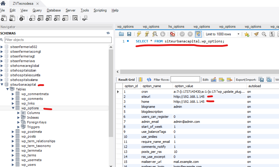 3- Ingresar a la base de datos y modificar en la tabla wp_options los links de conexión